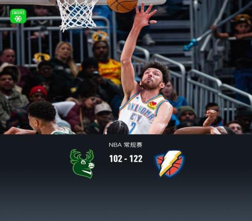 第四节雄鹿AJ-格林拿下8分,雷霆亚历山大拿下10分,最终雄鹿102-122不敌雷霆