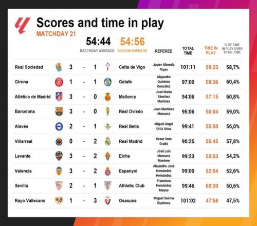 西甲第21轮没有任何一场比赛净时间达到60分钟,场均仅为54分44秒