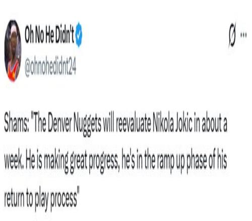 Shams在几周前曾透露,掘金队对约基奇能在本月底前复出持乐观态度。尽管如今看来,这一时间节点恐难实现,但他同时表示,这位老将中锋的康复过程并未遭遇任何波折,目前恢复情况“进展十分顺利”,正处于复出流程的“强度提升阶段”。