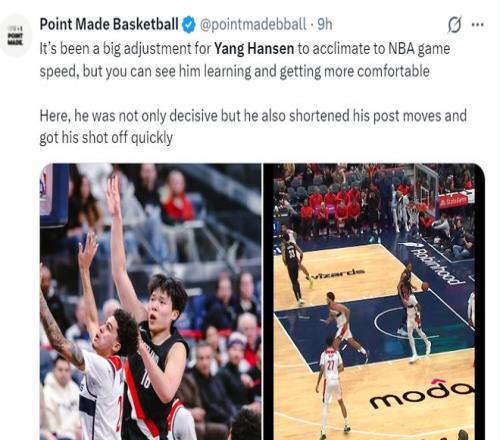 美媒:对于杨瀚森来说适应NBA的节奏是一大挑战,但你能看到他似乎已经逐渐适应了NBA的速率/节奏。他在防守端不断提速,而且在出手前缩短了跑动距离,从而很迅速的完成出手。