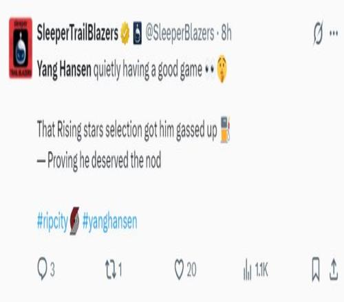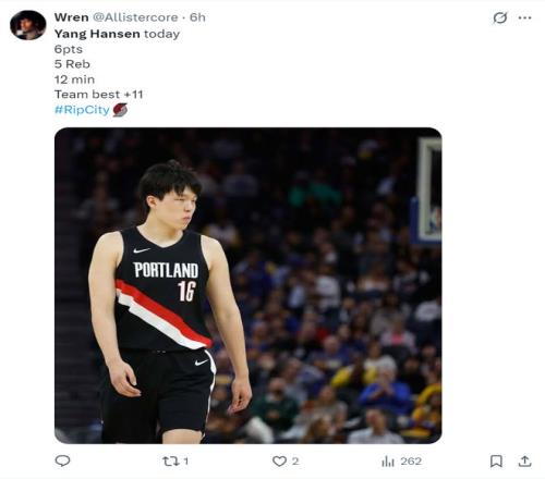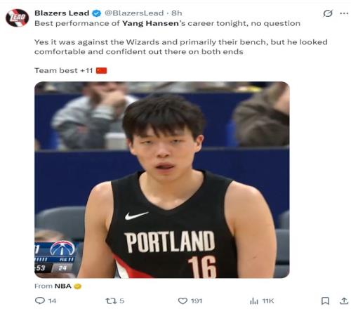 开拓者球迷:杨瀚森真的表现很好,他终于看起来像一个NBA球员了,继续保持下去吧。
