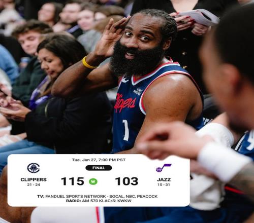 快船擒爵士近19战16胜小卡连续25场20+哈登16+10贝利20分