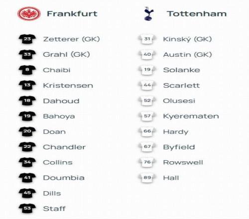 北京时间1月29日04:00,欧冠 联赛阶段第8轮,法兰克福主场迎战托特纳姆热刺,赛前双方球队首发名单公布如下:
