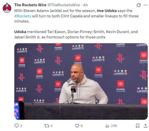在火箭VS马刺的赛前,乌度卡就谈到亚当斯的脚踝手术,卡佩拉会获得更多时间,小阵容也会打一段时间弥补亚当斯的空缺,球队目前正在讨论交易截止日前引进一名中锋球员。