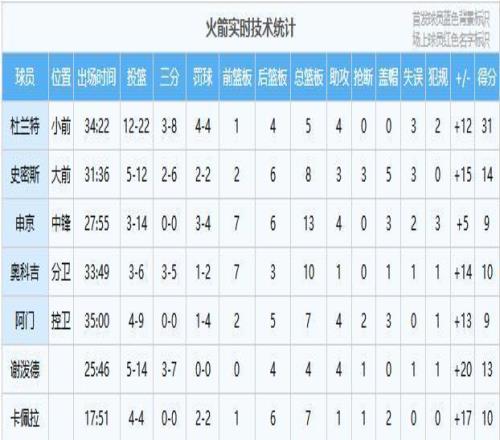 火箭:杜兰特31分5板4助、史密斯14分8板3助3断5帽、谢泼德13分4板4助、奥科吉10分10板1助、卡佩拉10分7板1助2帽、申京9分13板4助3帽、阿门9分7板4助2断3帽