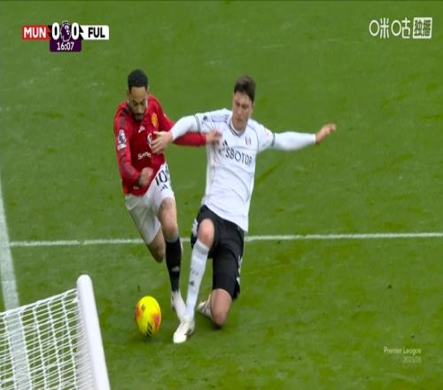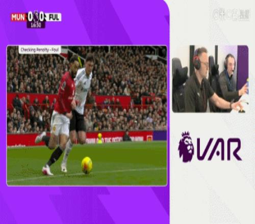 体育播报02月01日宣 英超第24轮,曼联vs富勒姆。比赛第16分钟,库尼亚突入禁区倒地,主裁判第一时间判点,VAR介入后判罚富勒姆球员禁区外拉人犯规,主裁改判任意球。