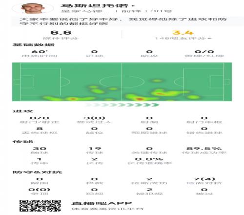 马斯坦托诺数据:零过人,零关键传球,两次抢断,获评6.6分